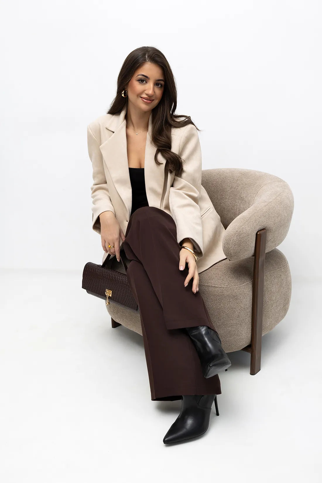 Marynarka posiada klasyczne klapy, pojedyncze zapięcie na guzik oraz prosty, lekko luźny krój, który zapewnia swobodę ruchów i świetnie układa się na sylwetce. Doskonale sprawdzi się zarówno w stylizacjach biznesowych, jak i codziennych – możesz nosić ją do sukienki, spódnicy czy ulubionych jeansów.