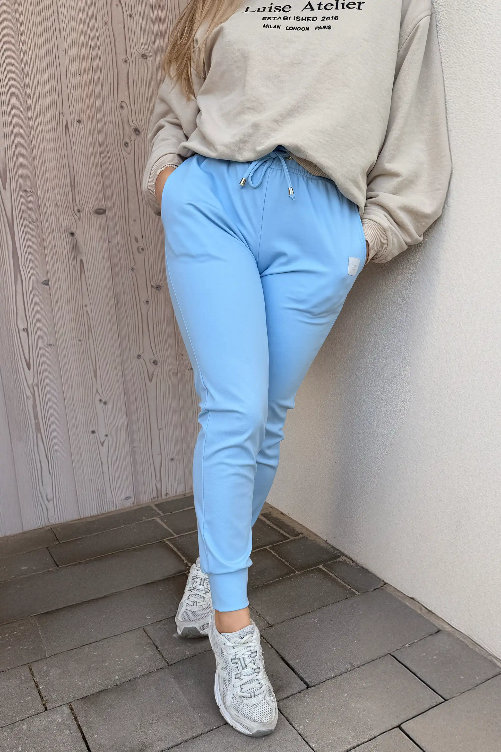 Wysokiej jakości spodnie wykonane z delikatnej wiskozy połączonej z nylonem elastanem Posiadają gumkę w pasie ,dwie kieszenie oraz ściągacz na dole nogawki.Ozdobione naszywką na lewej nogawce.